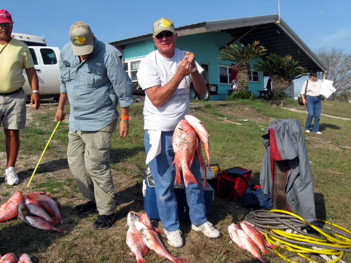 The four fish were heavy, and pulling the largest one to the surface was hard work. A total of 31 people were on the fishing trip and it took about three hours to fill out everyone's limit of Red Snapper. The travel time to the fishing location was 2½ hours each way.