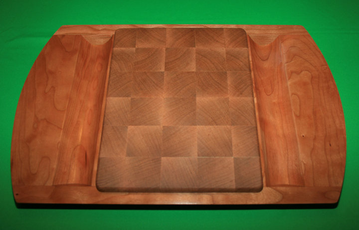 Woodsmith magazine stated that this was a weekend project; well, it turned out to be much more than that! The serving tray consists of two parts - the tray and the cutting board. The tray is made from Cherry, measures 16" long by 10½" wide, and the finish is food safe. The cutting board, which is removable and measures 7½"wide by 9½" deep, is made from maple with the cutting surface being the end grain; the surface is finished with food grade mineral oil. Mineral oil should be reapplied when the cutting surface appears dry. The cutting surface can be refurbished by sanding the surface smooth and applying a generous coat of food grade mineral oil.