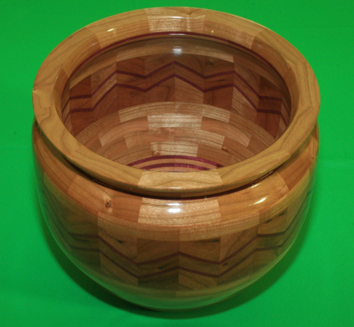 This is the first segmented bowl that Leon constructed. Leon learned this technique from Daryl Sullivan of Cedar Falls, IA in the woodshop at Victoria Palms Resort, Donna, TX. The bowl consists of eight layers each approximately one-half inch thick and constructed from 12 segments; six of the layers have alternating pieces of Maple and Black Walnut. The bowl diameter is approximately 7 inches. Multiple coats of a salad bowl finish renders the bowl food safe. An alternate design can be viewed by viewing the slide show.