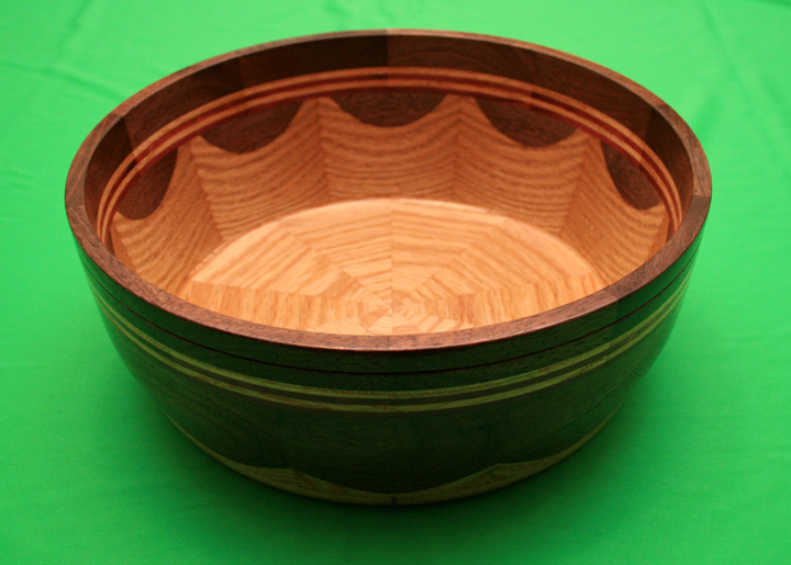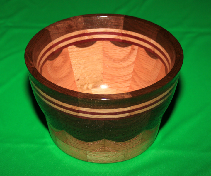 This bowl is fabricated from Red Oak, Black Walnut and Purple Heart with 10 segments per ring; the bowl has three layers - the base of Red Oak, the scalloped layer of Black Walnut and Red Oak, and the top layer composed of alternating 1/8 inch thick layers of Red Oak and Purple Heart with a final 1/2 thick layer of Black Walnut. The scallops result from the increasing diameter of the turned bowl. The small scallops on the inside develop in a similar manner as the underlying Red Oak is removed from the inside of the bowl. The bowl has a food safe finish.
