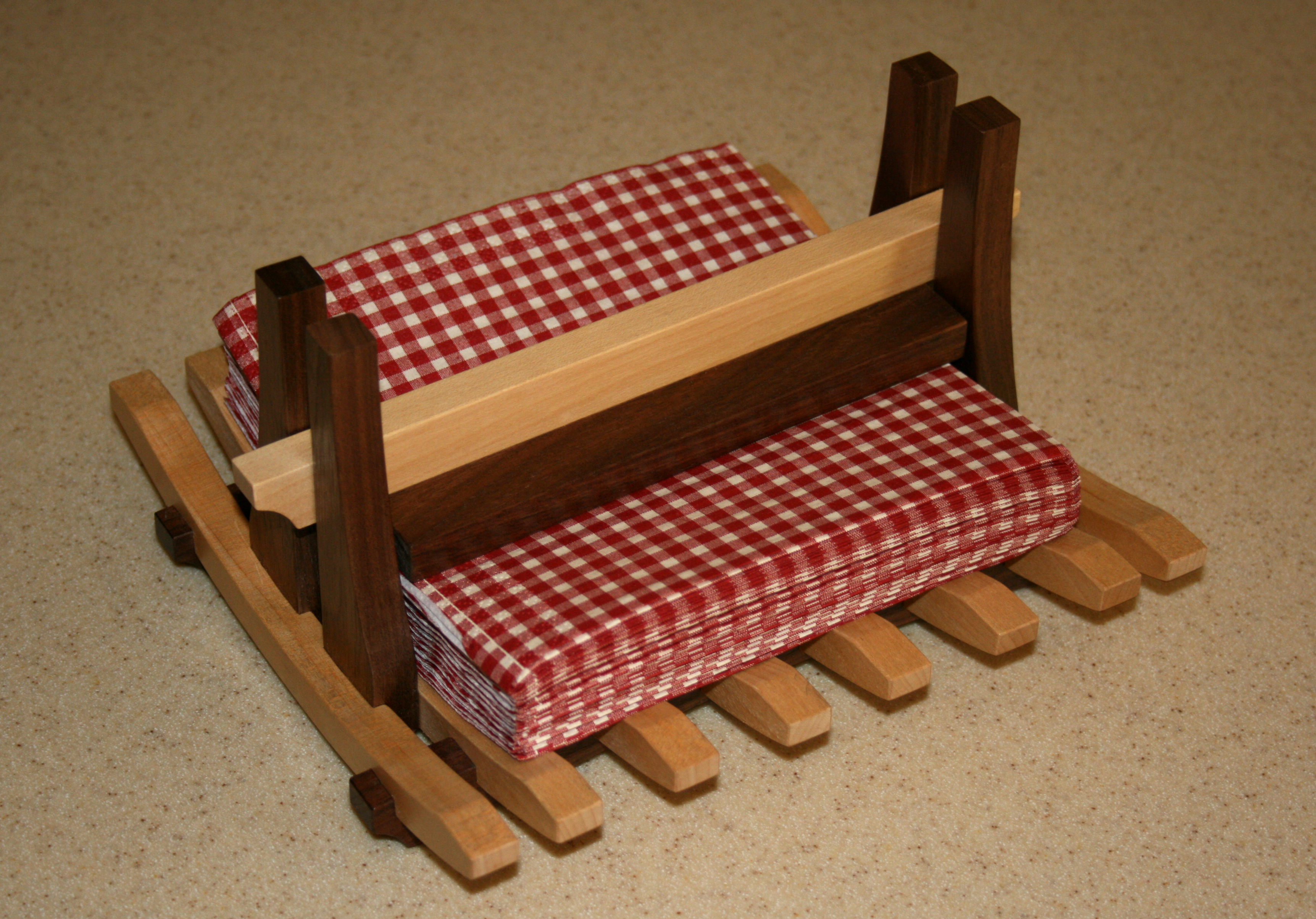 This napkin holder is perfect for use at an outdoor picnic - the removable holder prevents the napkins from being blown away by any breeze. It is fabricated from Maple or Red Oak and Black Walnut. Fabrication is easy, but one must be careful to make all the dado cuts at precisely the same location on each piece. Over the last few years Leon has made probably a couple dozen of them; most of them were gifts to family members and friends but some were sold at the silent auctions that were part of the Victoria Palms Woodshop chili fund raising dinners - the going price was $40.