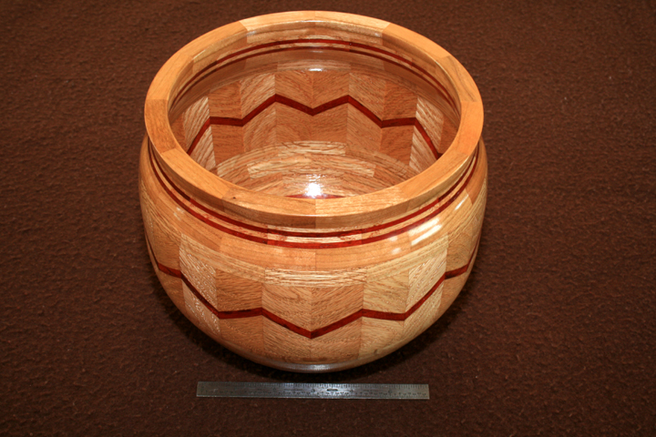 The feature ring of this bowl design presents a challenging fabrication process requiring many precise angle cuts and accurate positioning of pieces during the gluing steps. This bowl is constructed from Red Oak, Padauk and Cherry. The 6 inch scale provides an estimate of the size of the bowl. The bowl's finish is food safe.